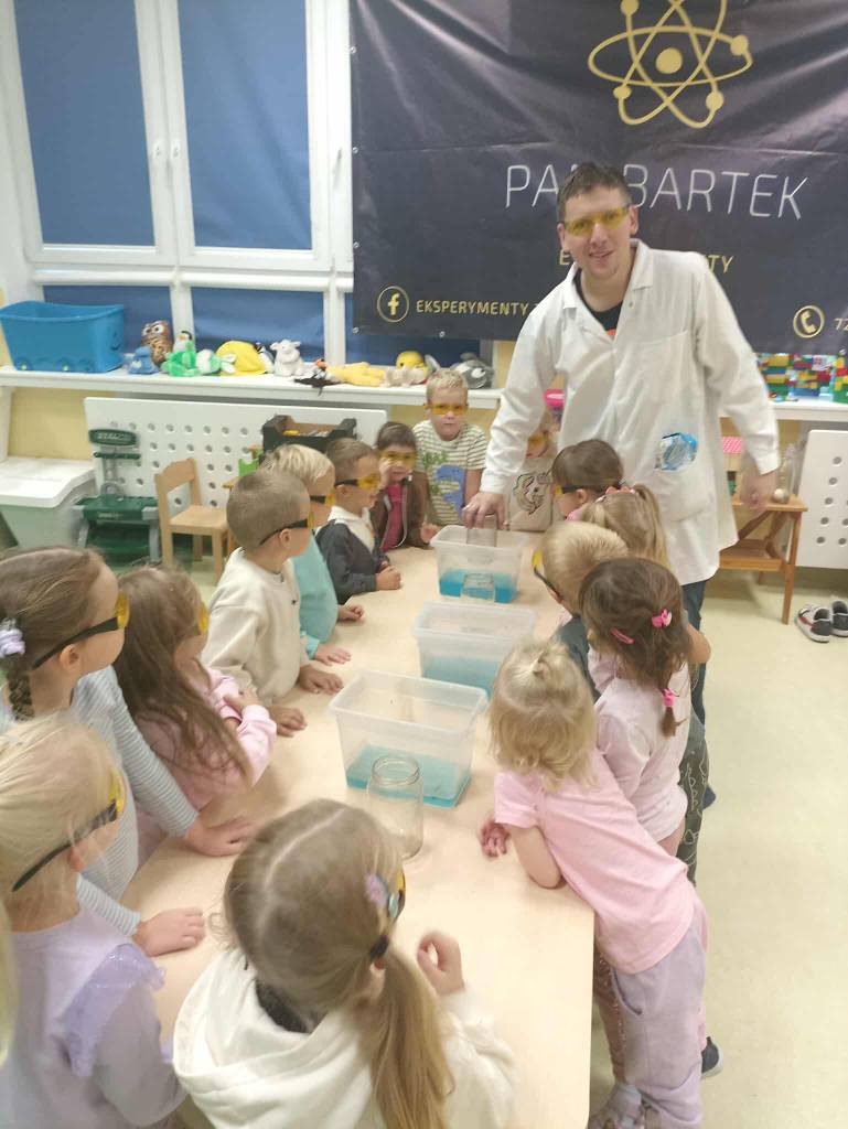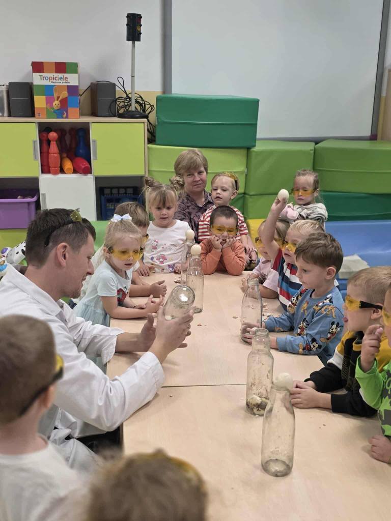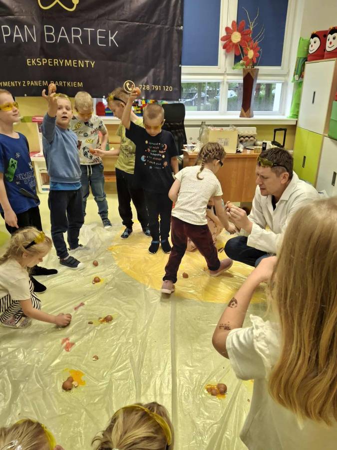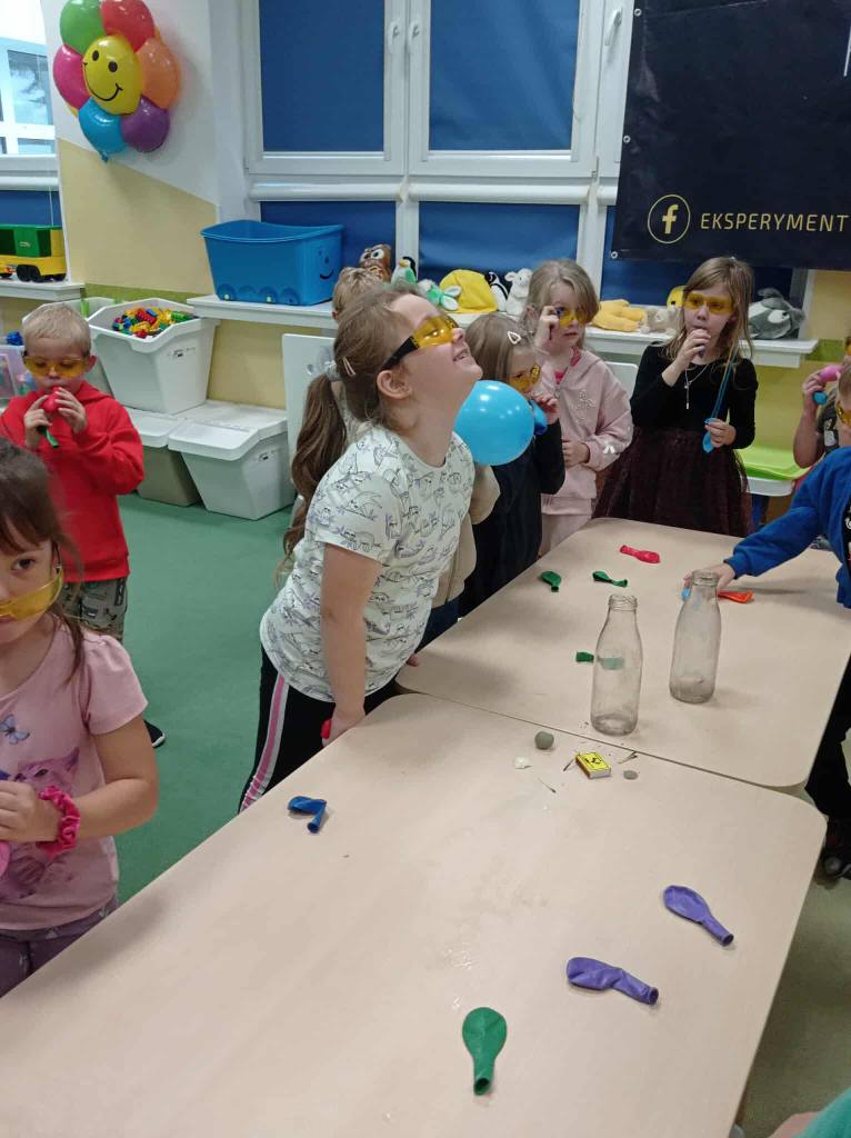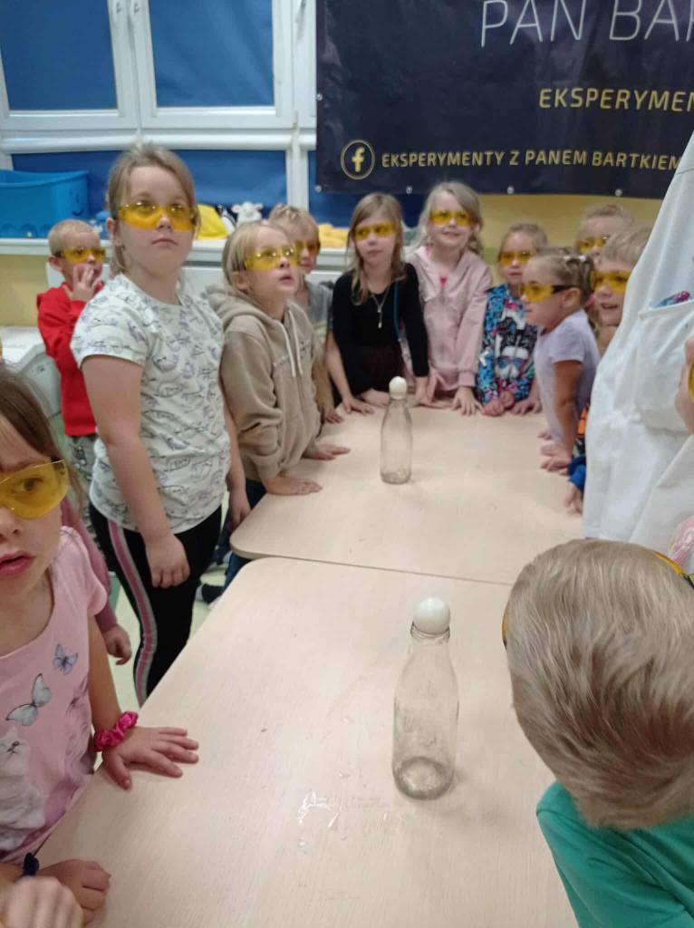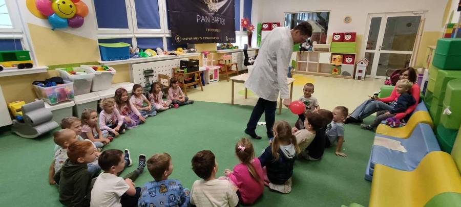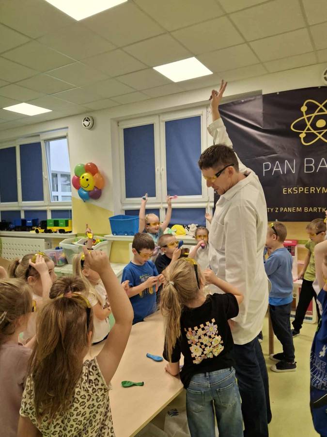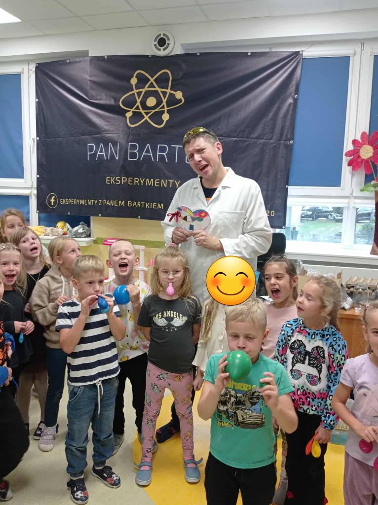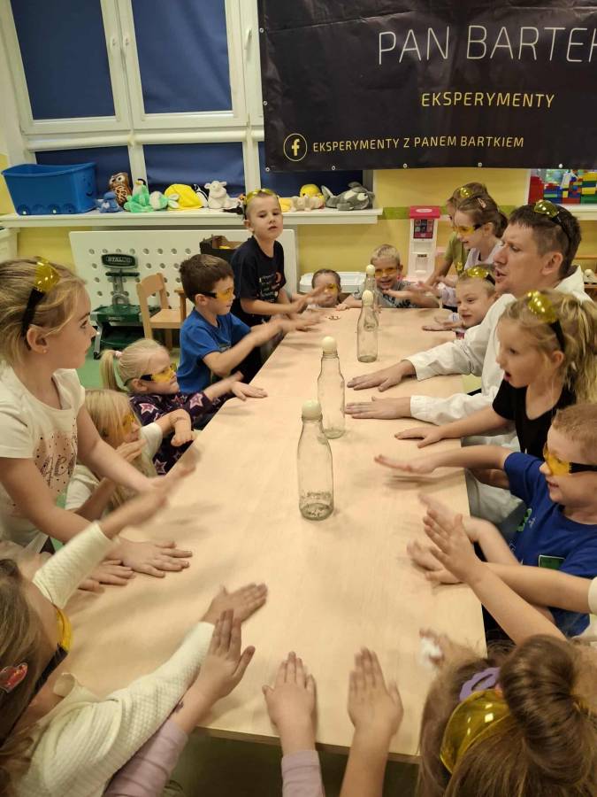 Eksperymenty z Panem Bartkiem odbywają się u nas cyklicznie od kilku lat, a prowadzący za każdym razem zaskakuje nas nowymi doświadczeniami. Tym razem podczas spotkania dzieci poznawały właściwości powietrza.