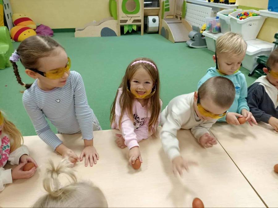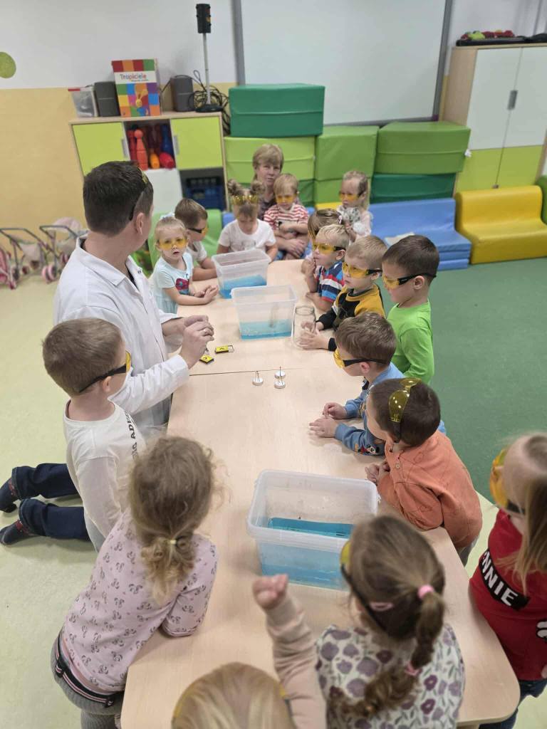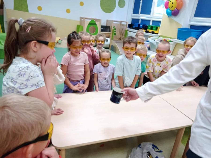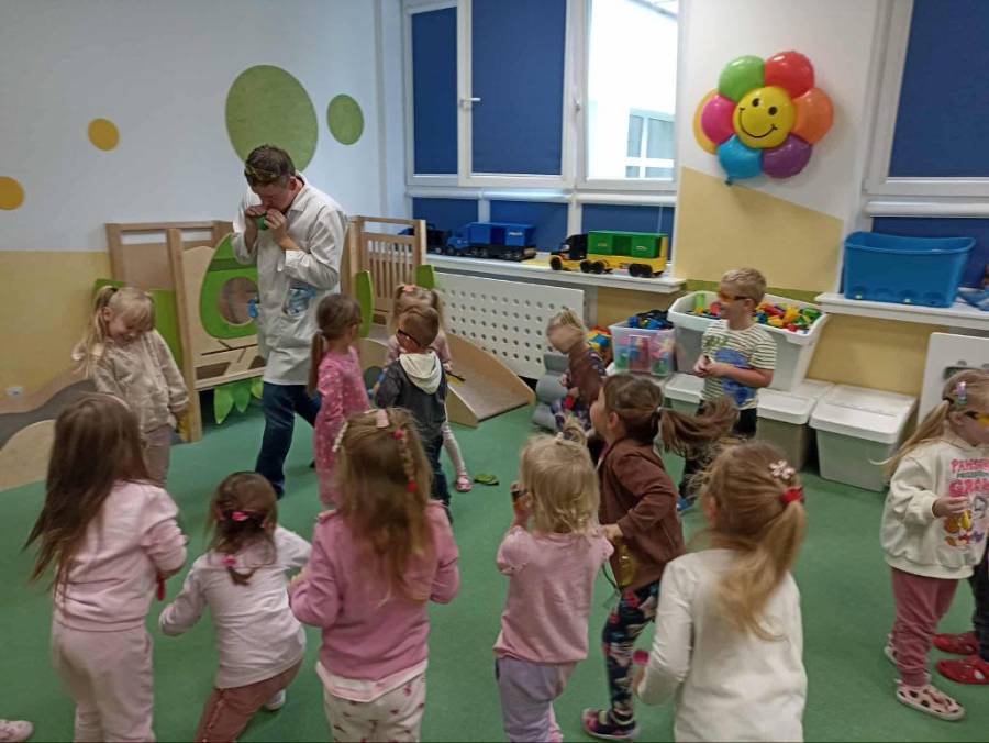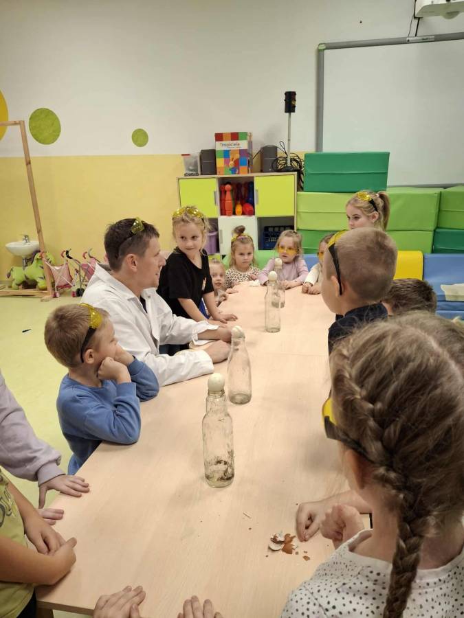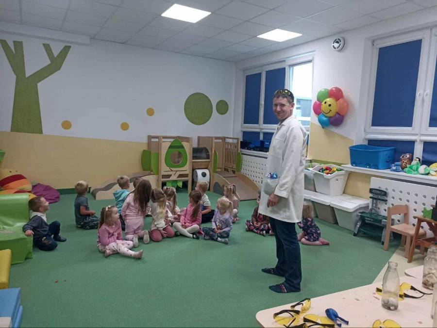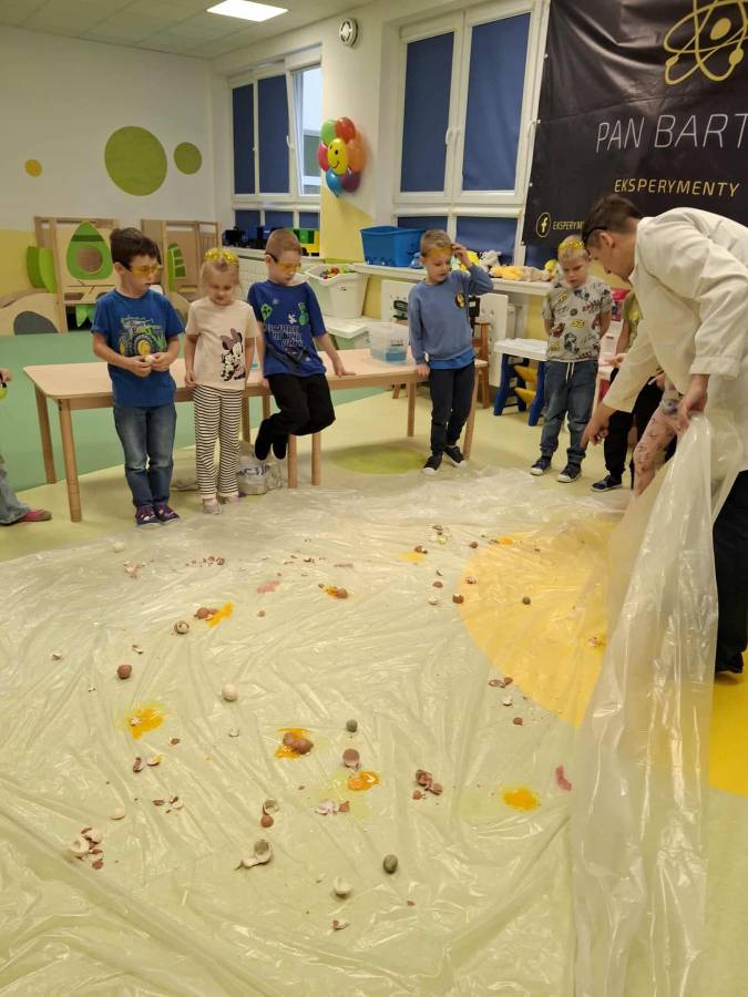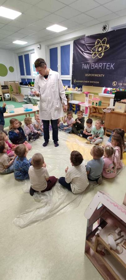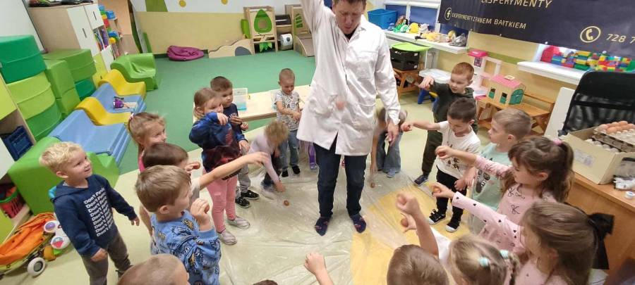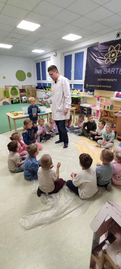 Eksperymenty z Panem Bartkiem odbywają się u nas cyklicznie od kilku lat, a prowadzący za każdym razem zaskakuje nas nowymi doświadczeniami. Tym razem podczas spotkania dzieci poznawały właściwości powietrza.