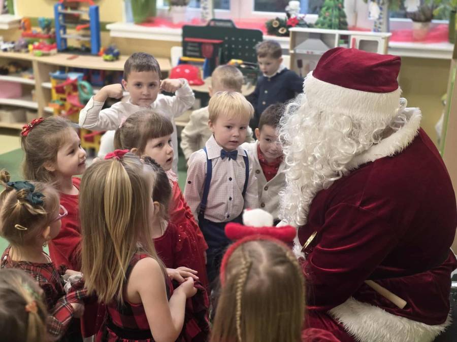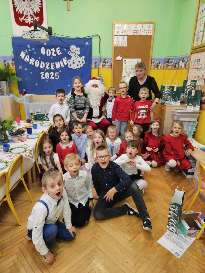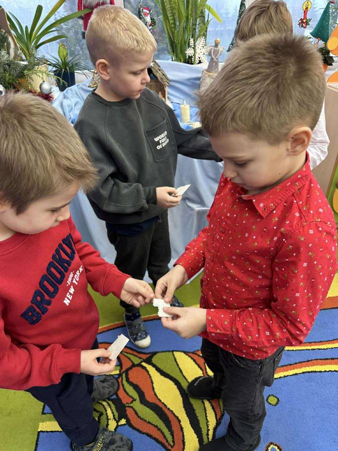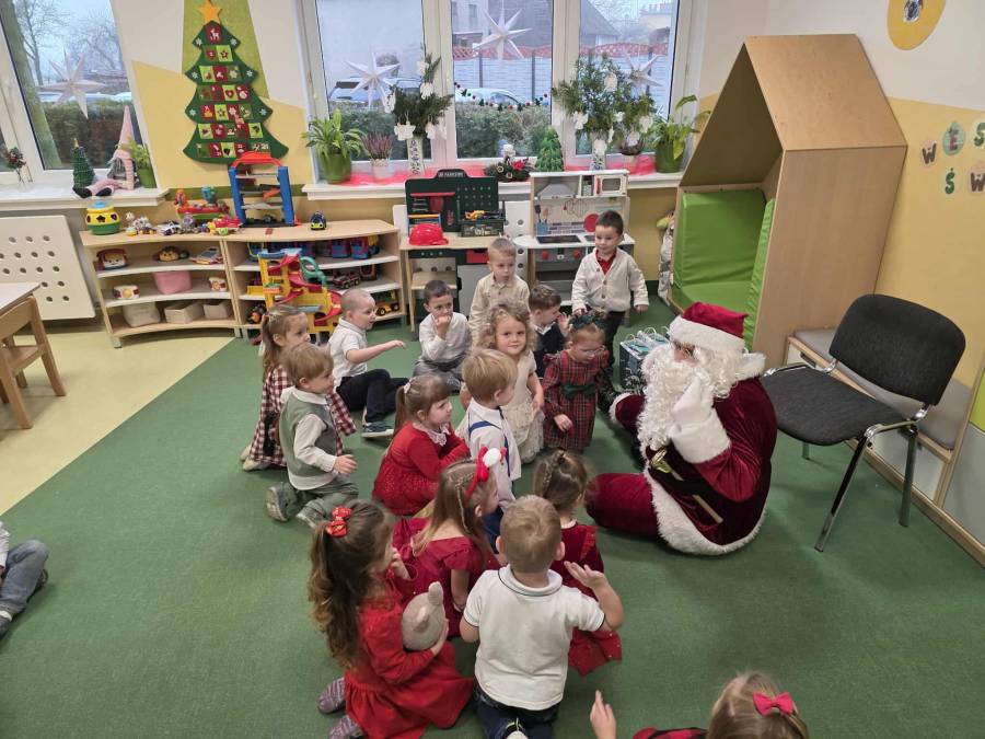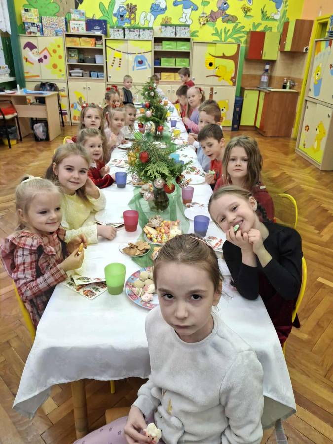 W dniu 17 grudnia w naszym przedszkolu odbyły się uroczyste spotkania wigilijne w grupach połączone z wizytą Gwiazdora. Był to wyjątkowy i długo wyczekiwany dzień, pełen radości, ciepła oraz świątecznej atmosfery. Dzieci podzieliły się opłatkiem, składając sobie wzajemnie serdeczne życzenia po czym usiadły przy wigilijnym stole. Po części wigilijnej nastąpił najbardziej wyczekiwany moment ? wizyta Gwiazdora. Gość przybył z workiem pełnym prezentów, co wywołało ogromną radość i entuzjazm wśród dzieci. Gwiazdor rozmawiał z przedszkolakami i wręczył każdemu dziecku upominek.