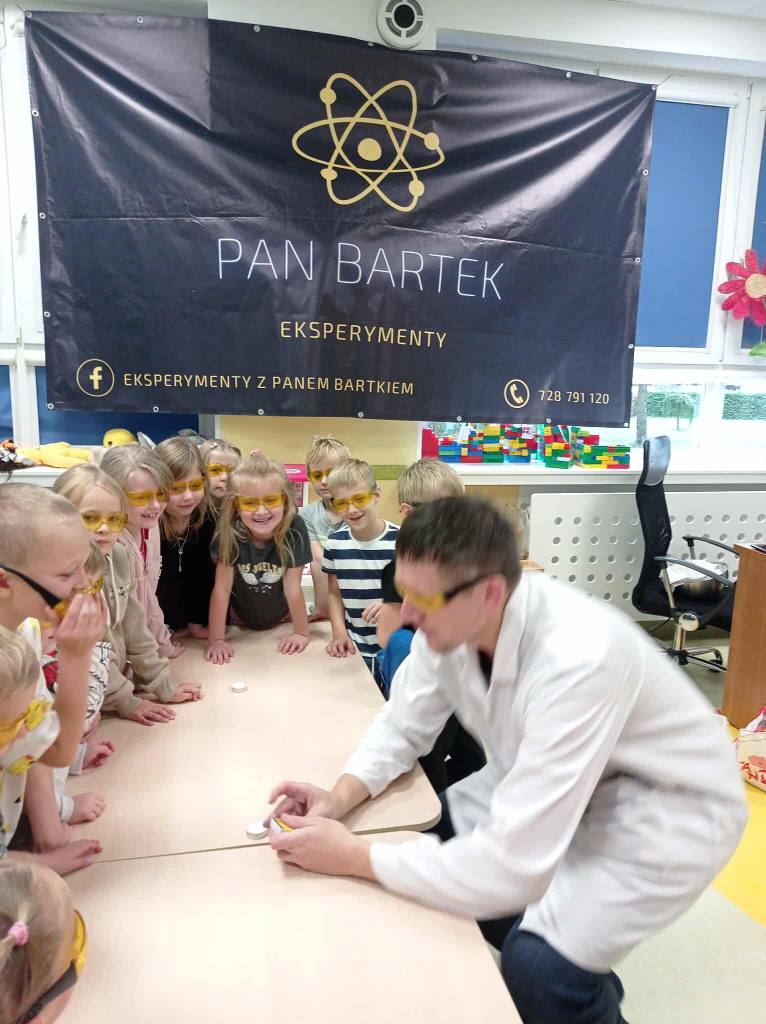 Eksperymenty z Panem Bartkiem odbywają się u nas cyklicznie od kilku lat, a prowadzący za każdym razem zaskakuje nas nowymi doświadczeniami. Tym razem podczas spotkania dzieci poznawały właściwości powietrza.